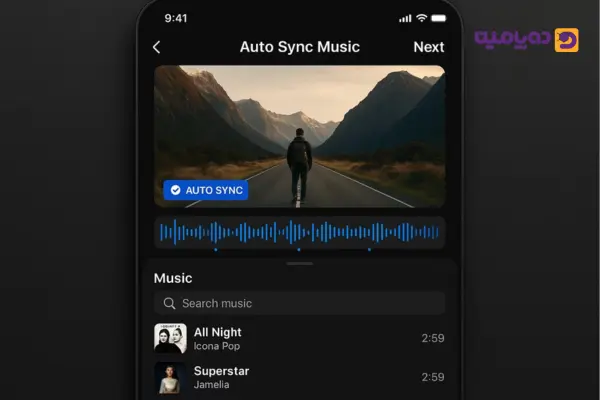 نحوه استفاده: در بخش موسیقی هنگام ساخت محتوا گزینه Auto Sync Music را انتخاب کنید؛ آهنگ بطور هوشمند با فریمهای ویدیو هماهنگ میشود.