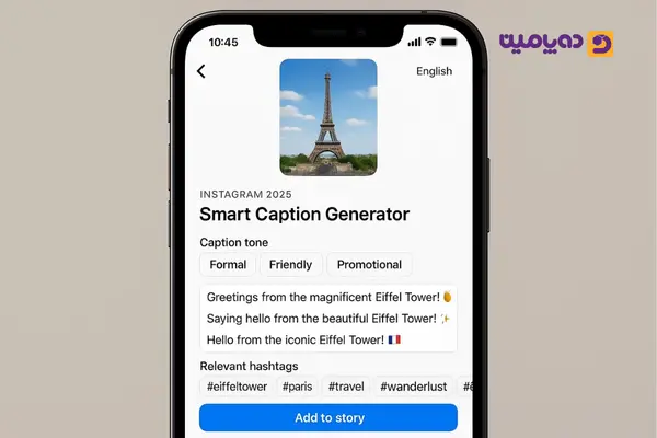 نحوه استفاده: هنگام درج کپشن، گزینهی Generate Caption را انتخاب کنید؛ سیستم چند گزینه از جمله توضیحات رسمی، دوستانه یا تبلیغاتی پیشنهاد میدهد تا نسخه دلخواه را انتخاب کنید.